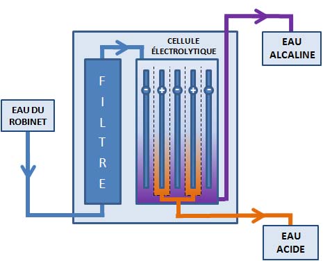 L'ionization brise le lien électronique qui existe entre les atomes d'hydrogène et d'oxygène d'une molécule d'eau [H2O] et produit de l'eau alcaline riche en ions d'hydroxyde [OH-] et de l'eau acide riche en ions d'hydrogène [H+].