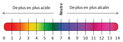 Le pH mesure le niveau d'acidité ou d'alcalinité d'une solution. Il fournit une valeur sur une échelle de 0 à 14 : une valeur de 7 est dite neutre, une valeur inférieure à 7 est dite acide, et une valeur supérieure à 7 est dite alcaline (ou basique). Plus on se rapproche de 0, plus la solution est acide, et de la même façon, plus on se rapproche de 14, plus la solution est alcaline.